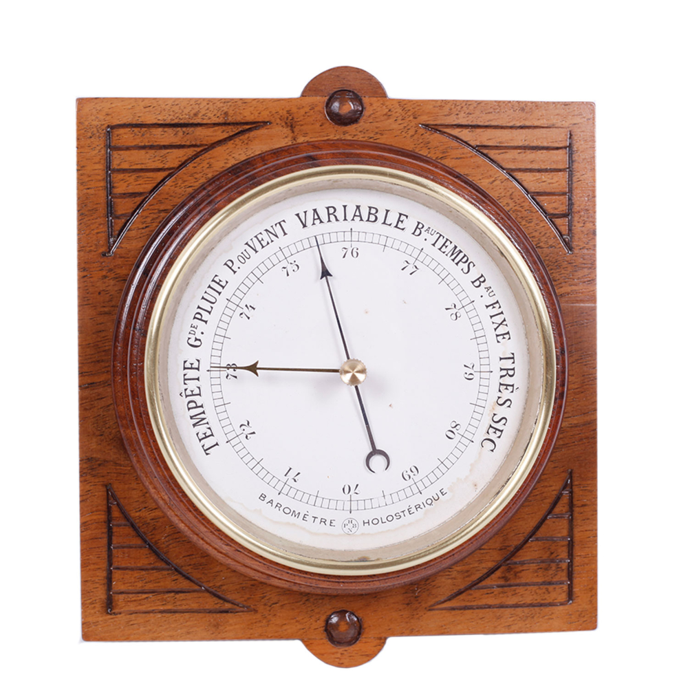 Ce baromètre anéroïde encastré dans un boîtier en bois finement travaillé est un bel objet alliant précision et charme ancien. Il est équipé d’un mécanisme NAUDET de haute précision, entièrement restauré, avec une tolérance de ±1 hPa.